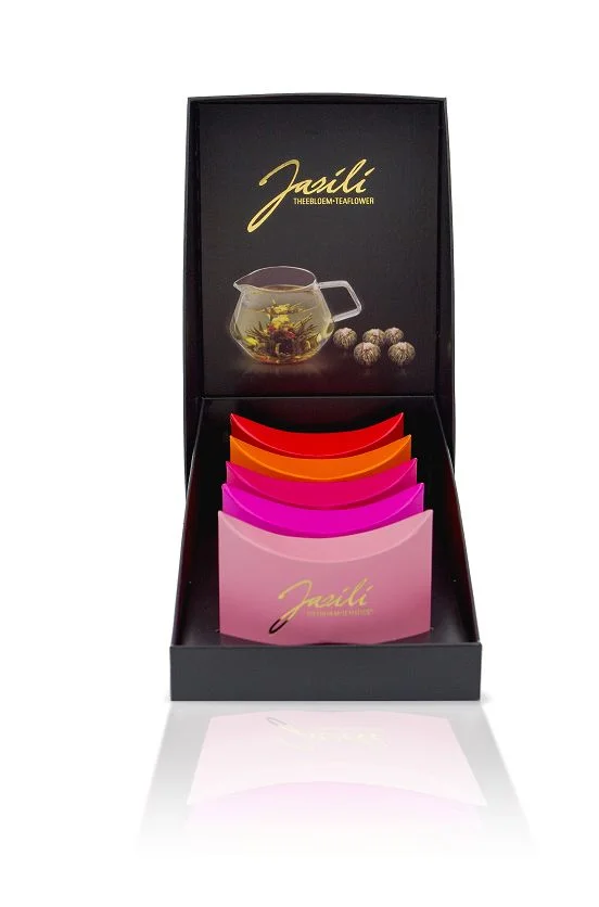 Een set van vijf de smaken de Jasili theebloemen zitten verpakt in een doosje. Jasili Theebloemen zijn van pure 100% kwaliteitsthee gemaakt.Lees meer